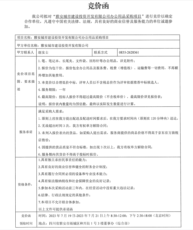 雅安城市建設(shè)投資開發(fā)有限公司辦公用品采購(gòu)項(xiàng)目競(jìng)價(jià)公告