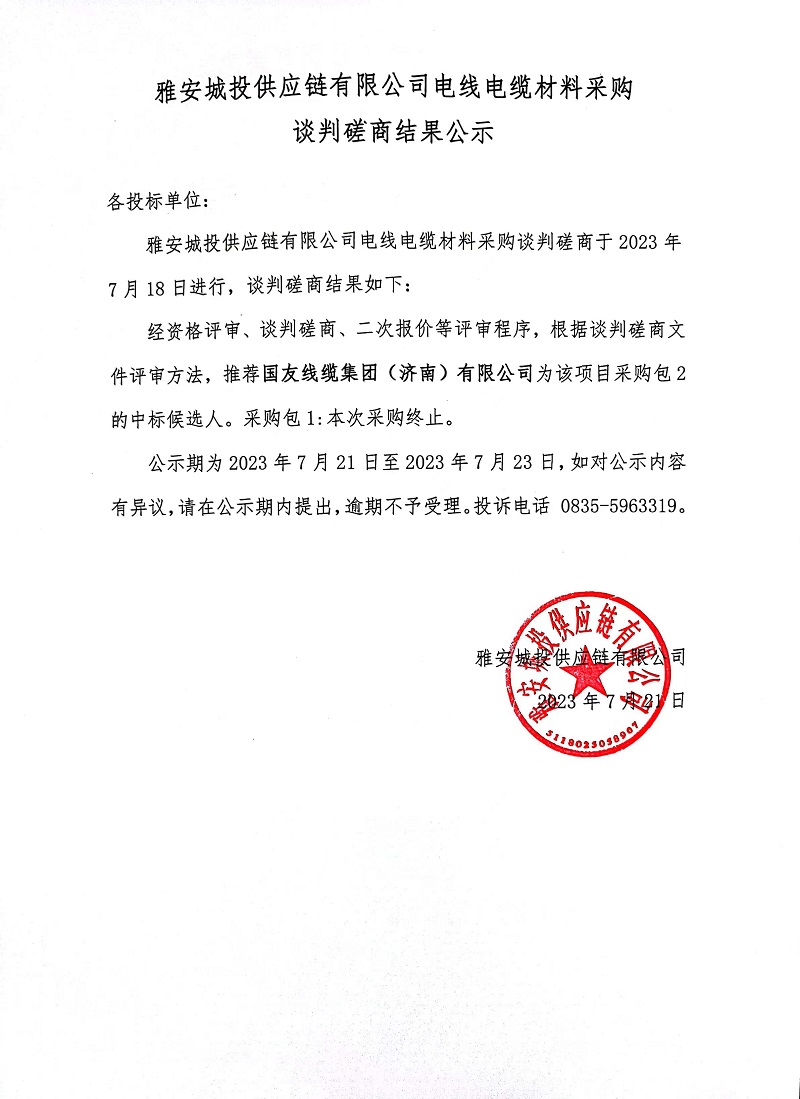 雅安城投供應(yīng)鏈有限公司電線電纜材料采購(gòu)談判磋商結(jié)果公示
