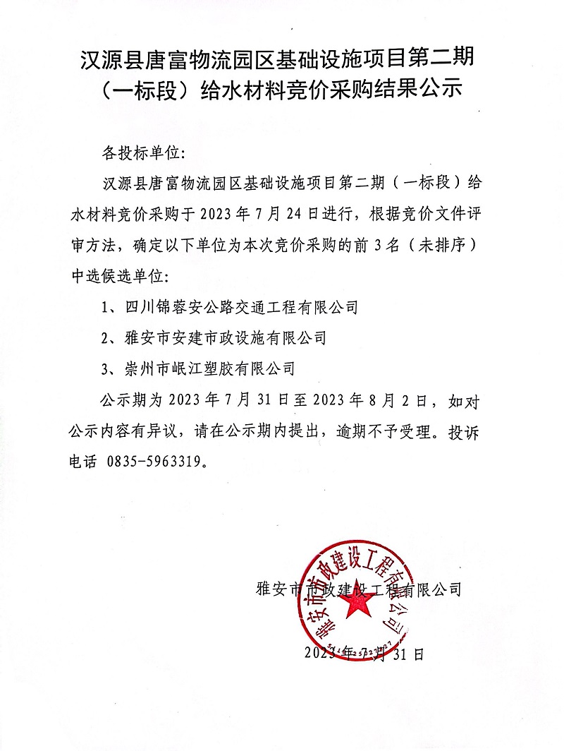 漢源縣唐富物流園區(qū)基礎(chǔ)設(shè)施項(xiàng)目第二期(一標(biāo)段)給水材料競(jìng)價(jià)采購結(jié)果公示