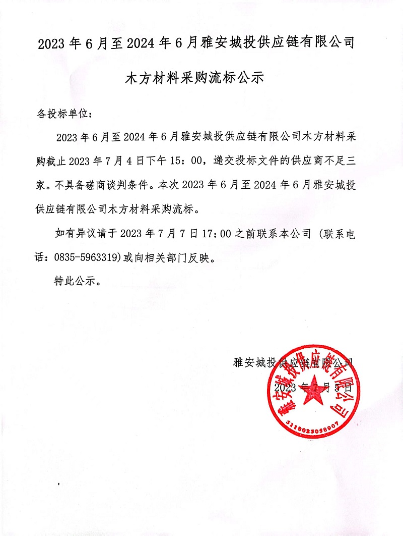 2023年6月至2024年6月雅安城投供應(yīng)鏈有限公司木方材料采購流標(biāo)公示