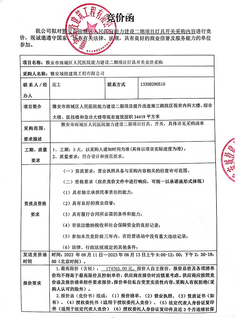 雅安市雨城區(qū)人民醫(yī)院能力建設(shè)二期項(xiàng)目燈具開(kāi)關(guān)采購(gòu)競(jìng)價(jià)公告