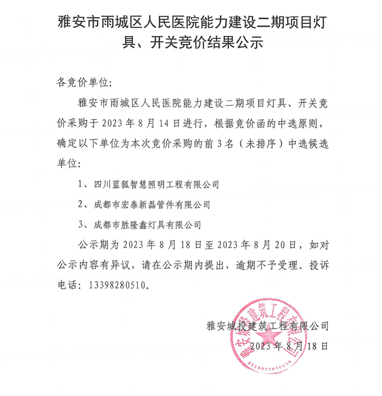 雅安市雨城區(qū)人民醫(yī)院能力建設(shè)二期項目燈具、開關(guān)競價結(jié)果公示