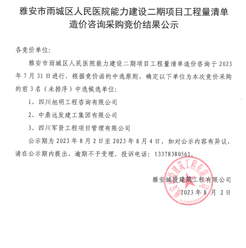 雅安市雨城區(qū)人民醫(yī)院能力建設(shè)二期項(xiàng)目工程量清單造價(jià)咨詢采購競價(jià)結(jié)果公示