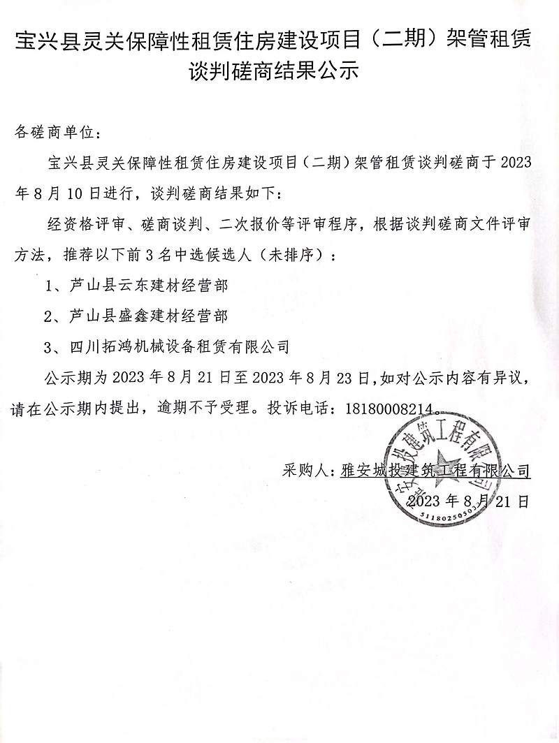 寶興縣靈關保障性租賃住房建設項目(二期)架管租賃談判磋商結果公示