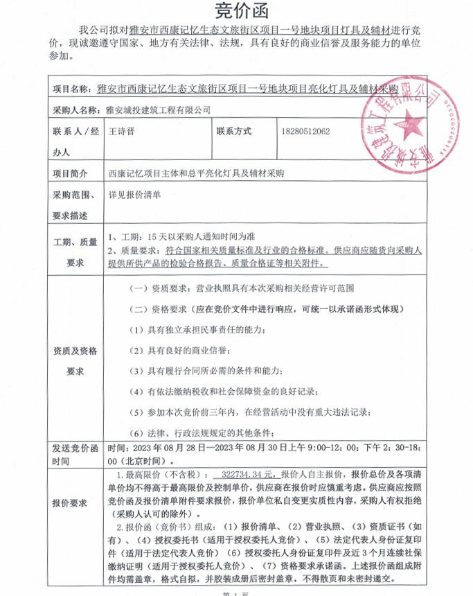 雅安市西康記憶生態(tài)文旅街區(qū)項(xiàng)目一號(hào)地塊項(xiàng)目燈具及輔材競(jìng)價(jià)采購公告