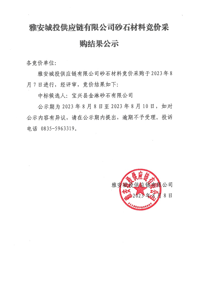 雅安城投供應(yīng)鏈有限公司砂石材料競價采購結(jié)果公示