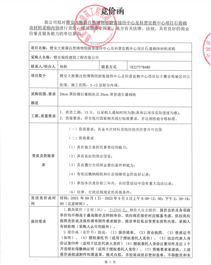 雅安大熊貓自然博物館游客接待中心及科普宣教中心項目石膏砌塊材料采購內(nèi)容競價公告