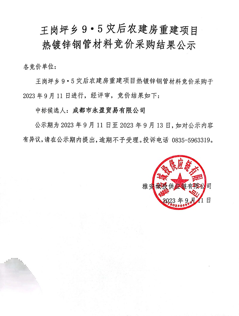 王崗坪鄉(xiāng)9.5災(zāi)后農(nóng)建房重建項目熱鍍鋅鋼管材料競價采購結(jié)果公示
