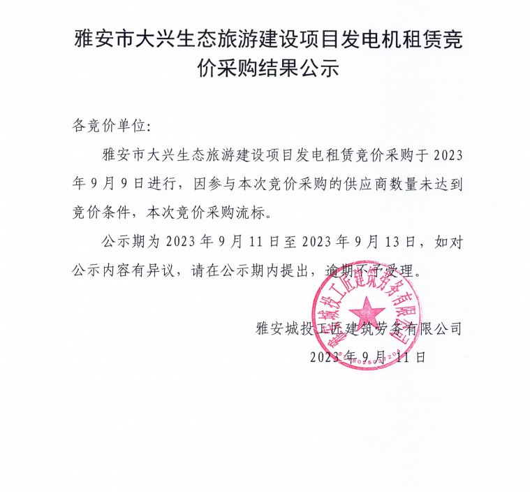 雅安市大興生態(tài)旅游建設(shè)項目發(fā)電機租賃競價采購結(jié)果公示