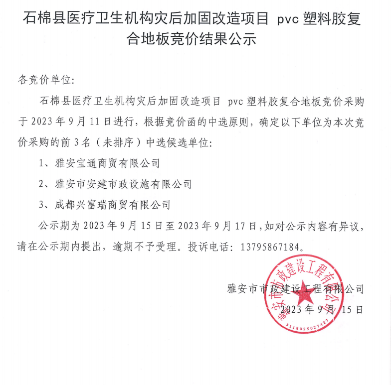 石棉縣醫(yī)療衛(wèi)生機(jī)構(gòu)災(zāi)后加固改造項(xiàng)目pvc塑料膠復(fù)合地板采購競價(jià)結(jié)果公示