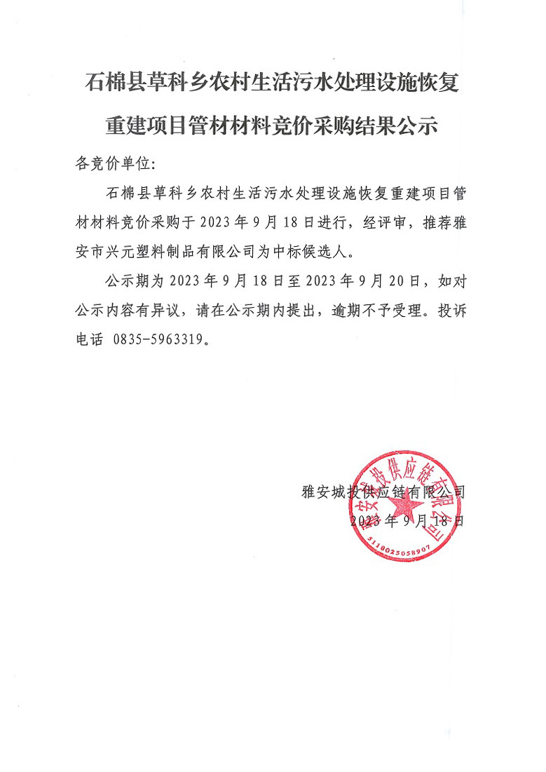 石棉縣草科鄉(xiāng)農(nóng)村生活污水處理設(shè)施恢復(fù)重建項目管材材料競價采購結(jié)果公示