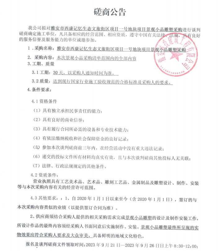 雅安市西康記憶生態(tài)文旅街區(qū)項(xiàng)目一號(hào)地塊項(xiàng)目景觀(guān)小品雕塑采購(gòu)談判磋商公告