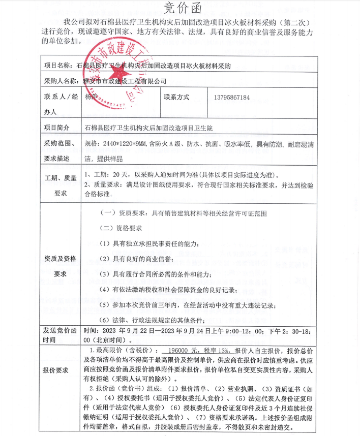 石棉縣醫(yī)療衛(wèi)生機(jī)構(gòu)災(zāi)后加固改造項(xiàng)目冰火板材料采購(第二次)競(jìng)價(jià)公告