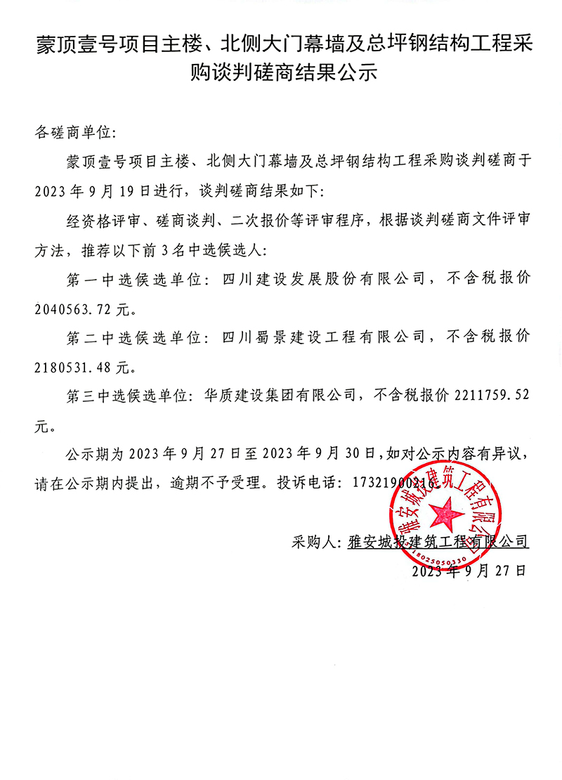 蒙頂壹號項(xiàng)目主樓、北側(cè)大門幕墻及總坪鋼結(jié)構(gòu)工程采購談判磋商結(jié)果公示