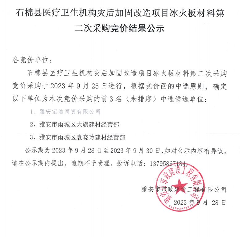 石棉縣醫(yī)療衛(wèi)生機(jī)構(gòu)災(zāi)后加固改造項(xiàng)目冰火板材料第二次采購競價結(jié)果公示