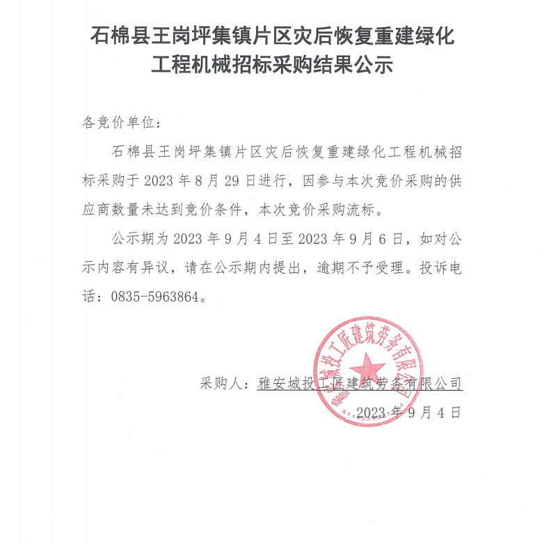 石棉縣王崗坪集鎮(zhèn)片區(qū)災(zāi)后恢復(fù)重建綠化工程機(jī)械招標(biāo)采購結(jié)果公示