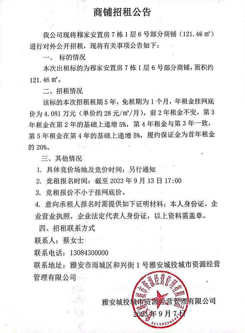穆家安置房7棟1層6號(hào)部分商鋪招租公告