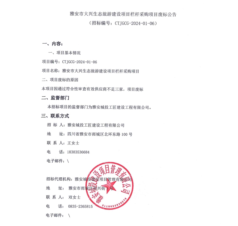 雅安市大興生態(tài)旅游建設(shè)項目欄桿采購項目廢標(biāo)公告