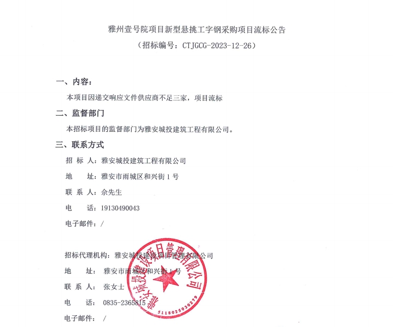 雅州壹號(hào)院項(xiàng)目新型懸挑工字鋼采購項(xiàng)目流標(biāo)公告