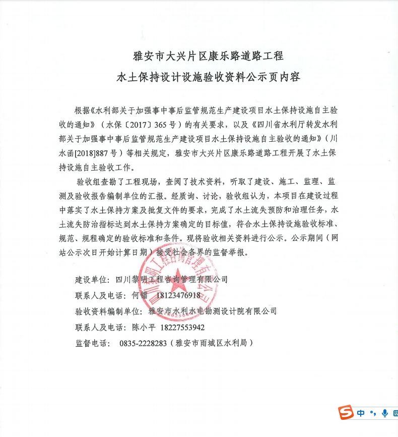 雅安市大興片區(qū)康樂路道路工程水土保持設(shè)計(jì)設(shè)施驗(yàn)收資料公示頁內(nèi)容
