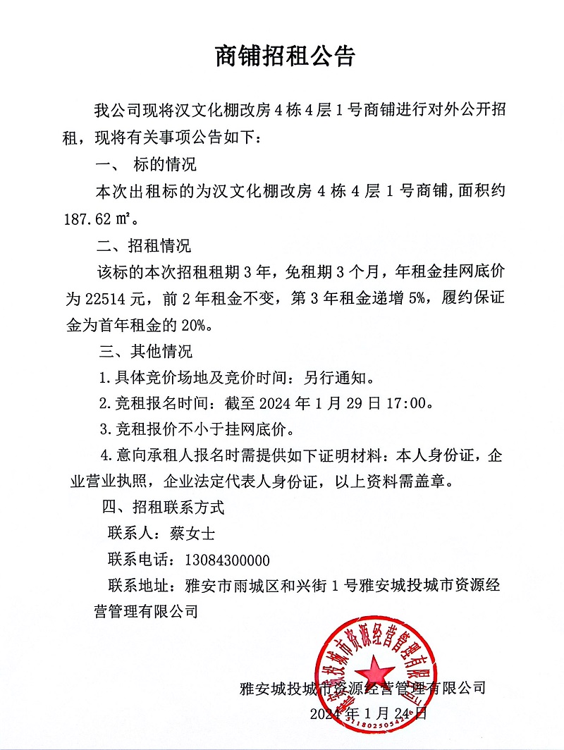 漢文化棚改房4棟4層1號商鋪招租公告