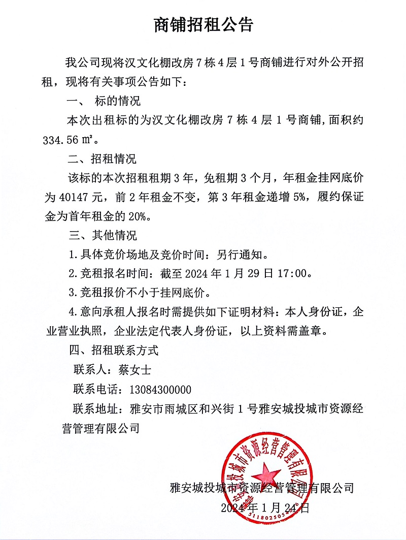 漢文化棚改房7棟4層1號(hào)商鋪招租公告