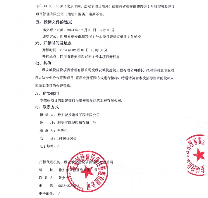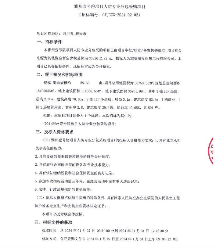 雅州壹號(hào)院項(xiàng)目人防專(zhuān)業(yè)分包采購(gòu)項(xiàng)目公告