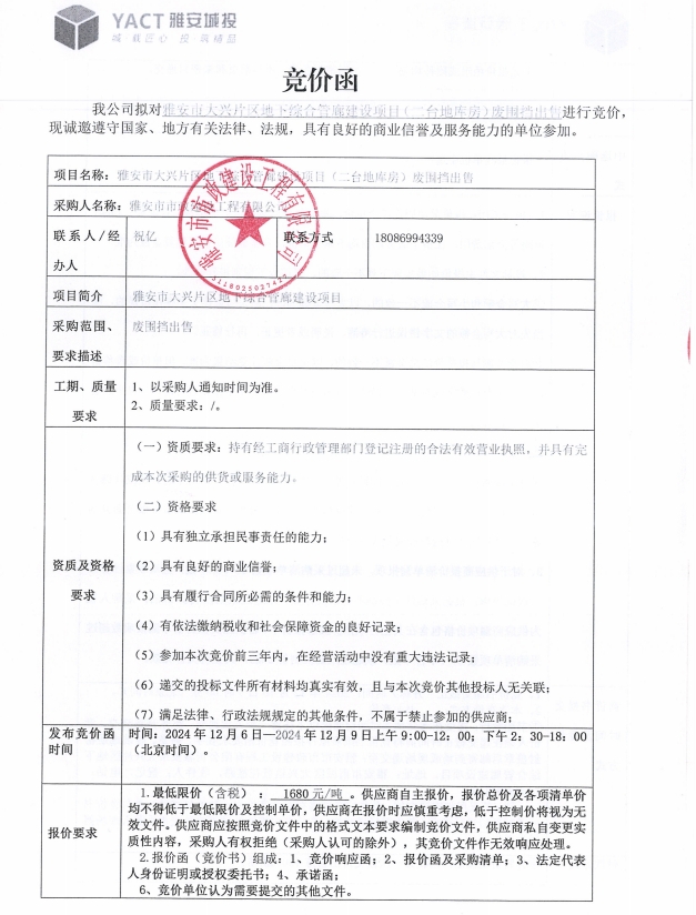 雅安市大興片區(qū)地下綜合管廊建設項目(二臺地庫房)廢圍擋出售競價公告