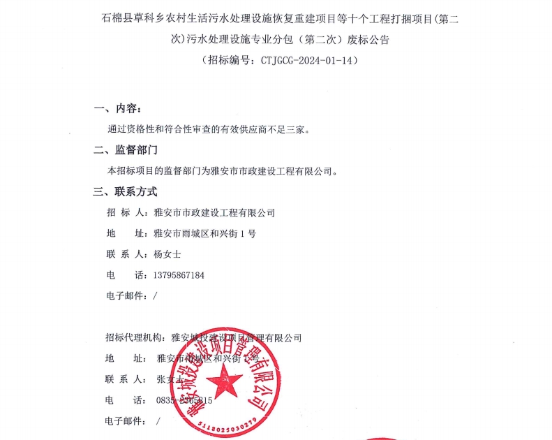 石棉縣草科鄉(xiāng)農(nóng)村生活污水處理設施恢復重建項目等十個工程打捆項目(第二次)污水處理設施專業(yè)分包(第二次)廢標公告