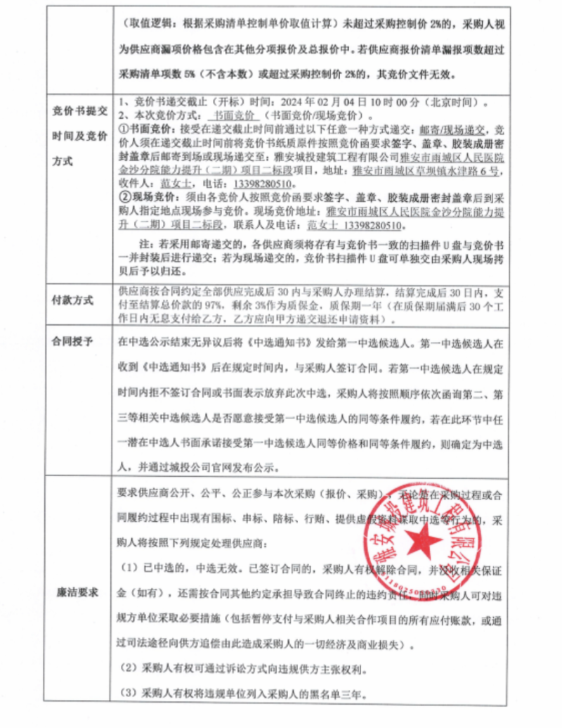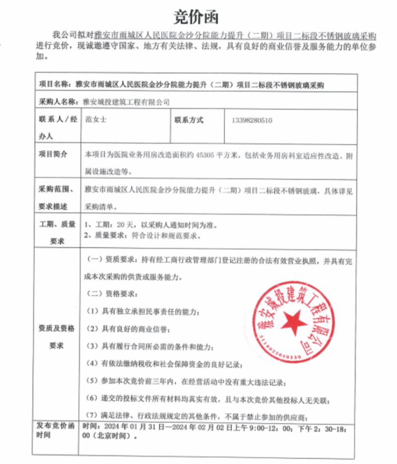 雅安市雨城區(qū)人民醫(yī)院金沙分院能力提升(二期)項(xiàng)目二標(biāo)段不銹鋼玻璃采購競價(jià)公告