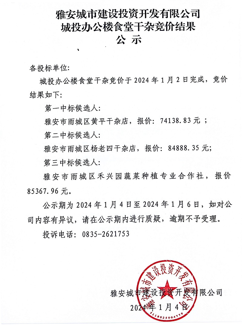雅安城市建設(shè)投資開發(fā)有限公司城投辦公樓食堂干雜競(jìng)價(jià)結(jié)果公示