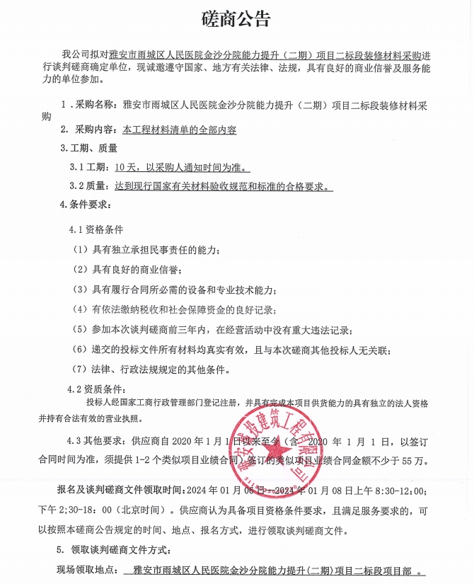 雅安市雨城區(qū)人民醫(yī)院金沙分院能力提升(二期)項目二標段裝修材料采購談判磋商公告