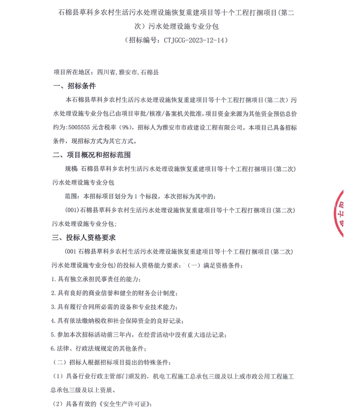 石棉縣草科鄉(xiāng)農(nóng)村生活污水處理設(shè)施恢復(fù)重建項(xiàng)目等十個(gè)工程打捆項(xiàng)目(第二次)污水處理設(shè)施專(zhuān)業(yè)分包采購(gòu)公告