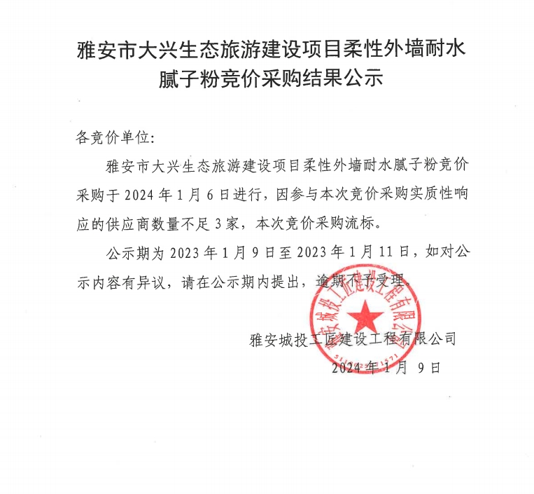 雅安市大興生態(tài)旅游建設項目柔性外墻耐水膩子粉材料競價采購結果公示