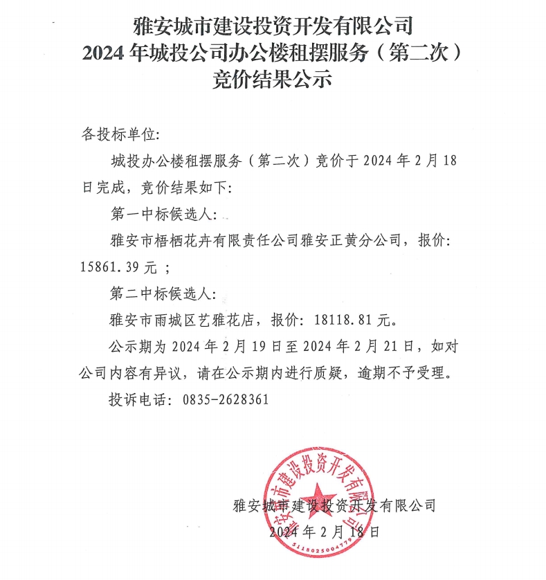雅安城市建設(shè)投資開發(fā)有限公司2024年城投公司辦公樓租擺服務(wù)(第二次)競價結(jié)果公示