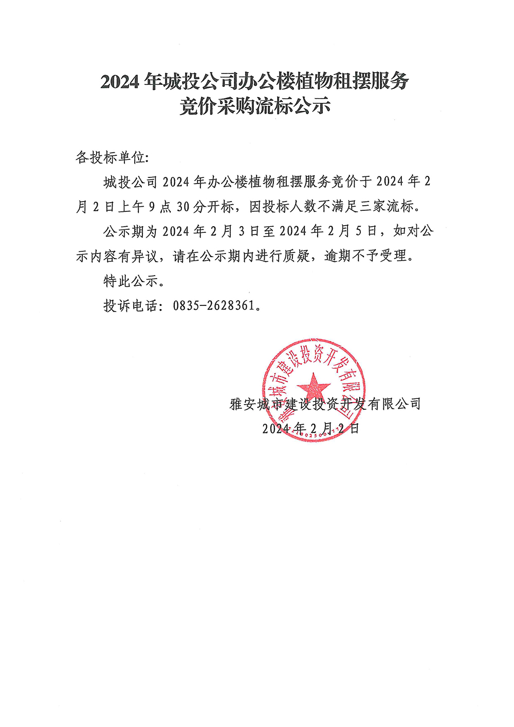 2024年城投公司辦公樓植物租擺服務(wù)競價(jià)采購流標(biāo)公示