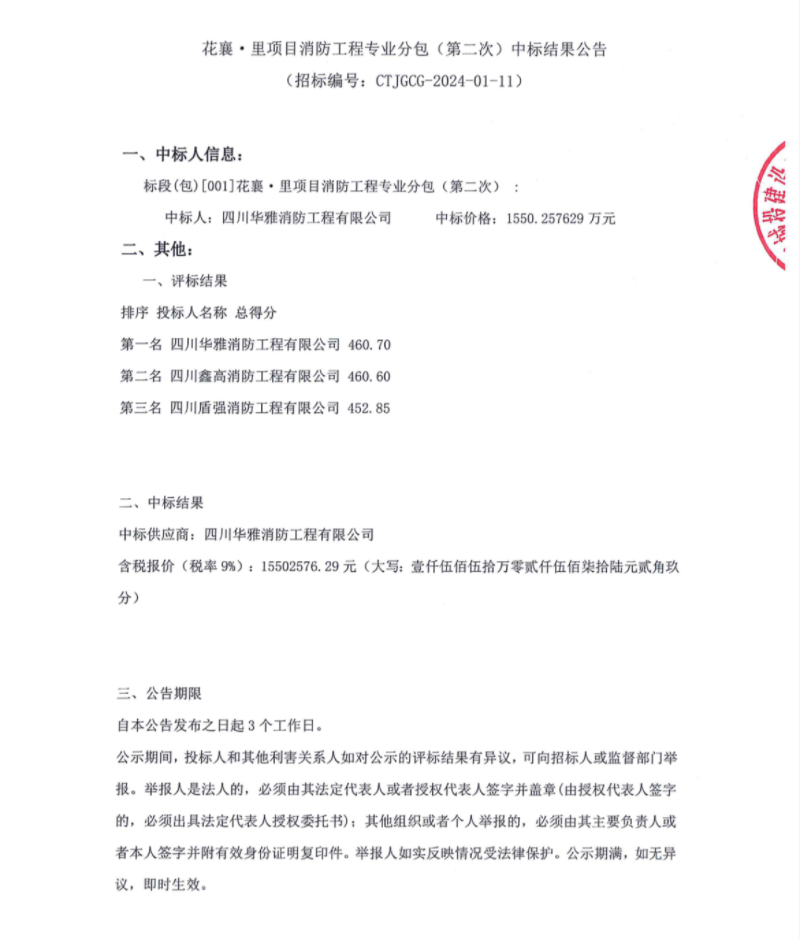花襄·里項目消防工程專業(yè)分包(第二次)中標結果公告