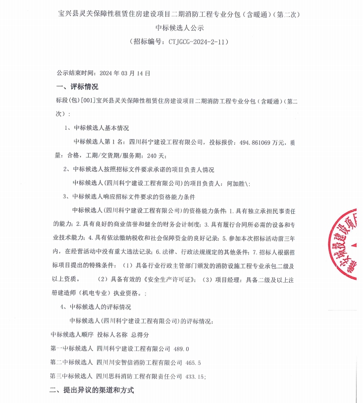 寶興縣靈關(guān)保障性租賃住房建設(shè)項目二期消防工程專業(yè)分包(含暖通)(第二次)中標(biāo)候選人公示