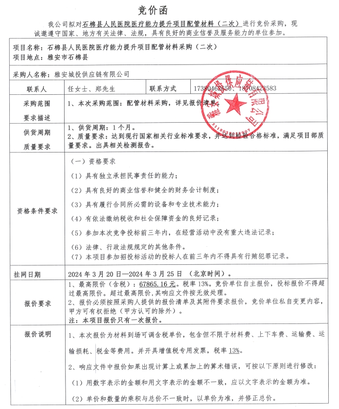 石棉縣人民醫(yī)院醫(yī)療能力提升項(xiàng)目配管材料(二次)競(jìng)價(jià)公告