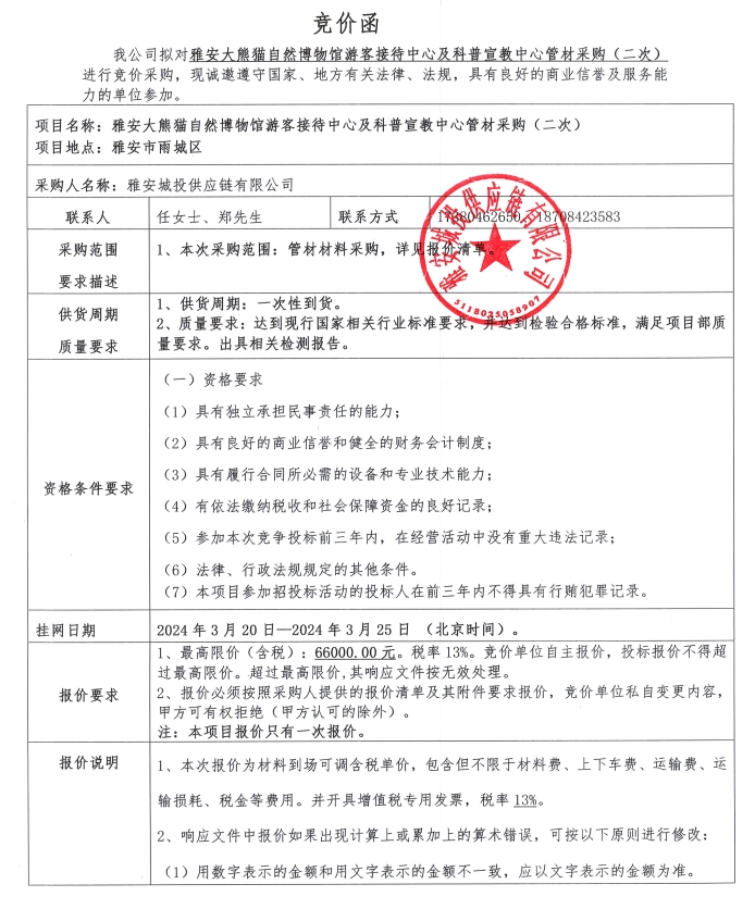 雅安大熊貓自然博物館游客接待中心及科普宣教中心管材采購(二次)競價公告