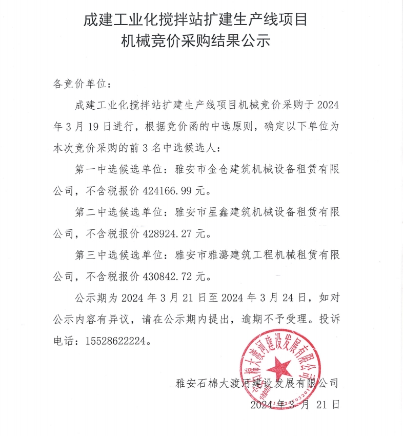 成建工業(yè)化攪拌站擴(kuò)建生產(chǎn)線(xiàn)項(xiàng)目機(jī)械競(jìng)價(jià)采購(gòu)結(jié)果公示