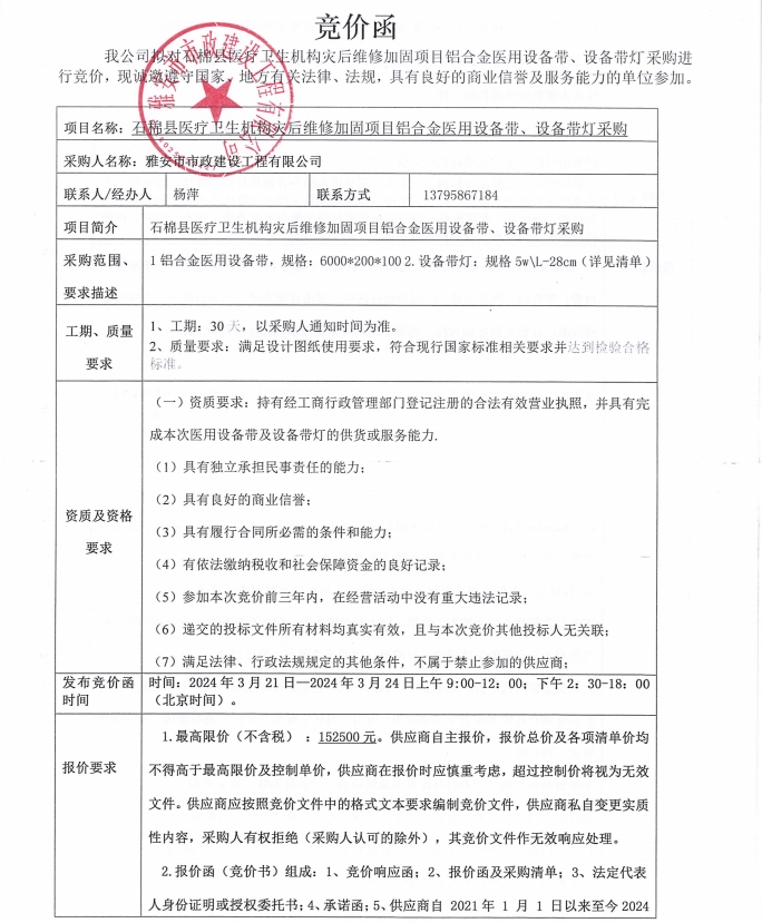石棉縣醫(yī)療衛(wèi)生機構(gòu)災后維修加固項目鋁合金醫(yī)用設(shè)備帶、設(shè)備帶燈采購競價公告
