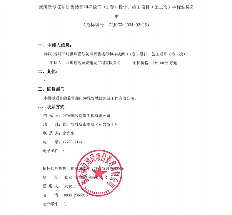 雅州壹號院項目售樓部和樣板間(3套)設計、施工項目(第二次)中標結果公示