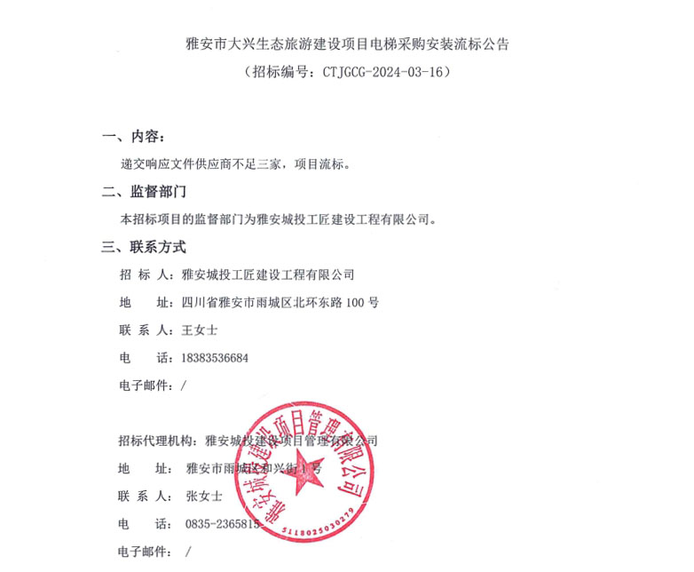 雅安市大興生態(tài)旅游建設(shè)項目電梯采購安裝流標公告