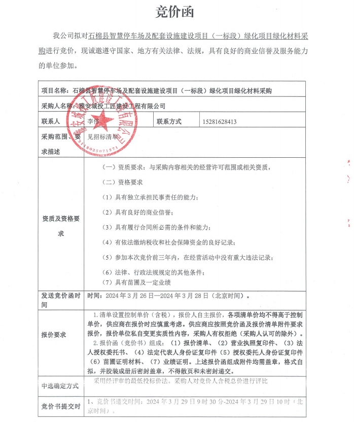 石棉縣智慧停車(chē)場(chǎng)及配套設(shè)施建設(shè)項(xiàng)目(一標(biāo)段)綠化項(xiàng)目綠化材料采購(gòu)競(jìng)價(jià)公告