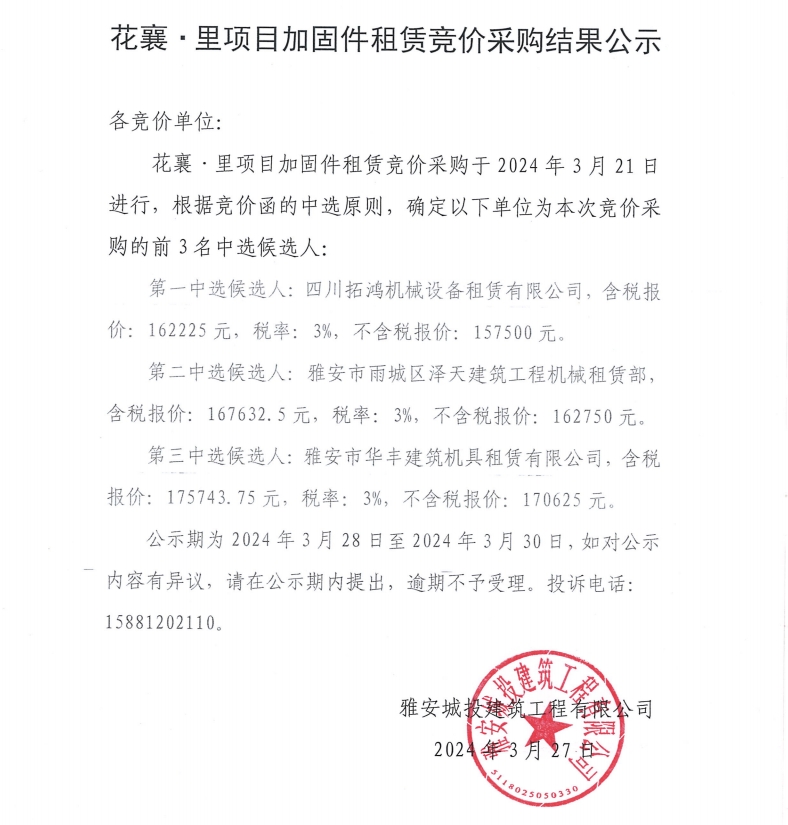 花襄·里項(xiàng)目加固件租賃競(jìng)價(jià)采購結(jié)果公示