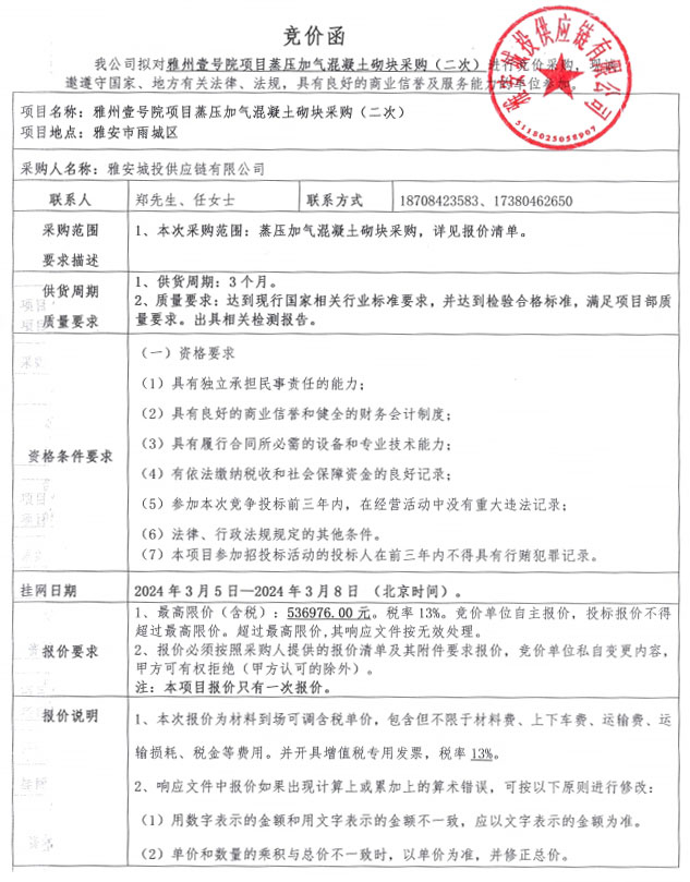 雅州壹號(hào)院項(xiàng)目蒸壓加氣混凝土砌塊采購(gòu)(第二次)競(jìng)價(jià)公告