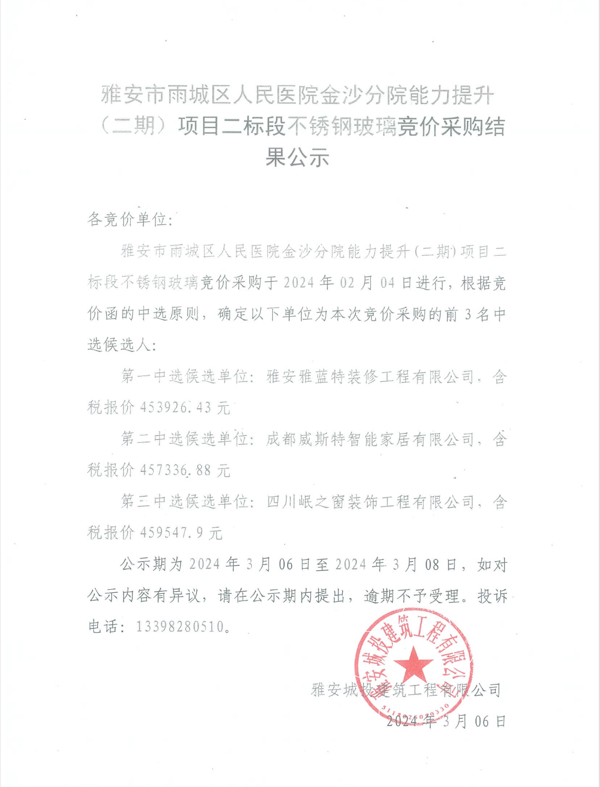 雅安市雨城區(qū)人民醫(yī)院金沙分院能力提升(二期)項(xiàng)目二標(biāo)段不銹鋼玻璃競(jìng)價(jià)采購結(jié)果公示