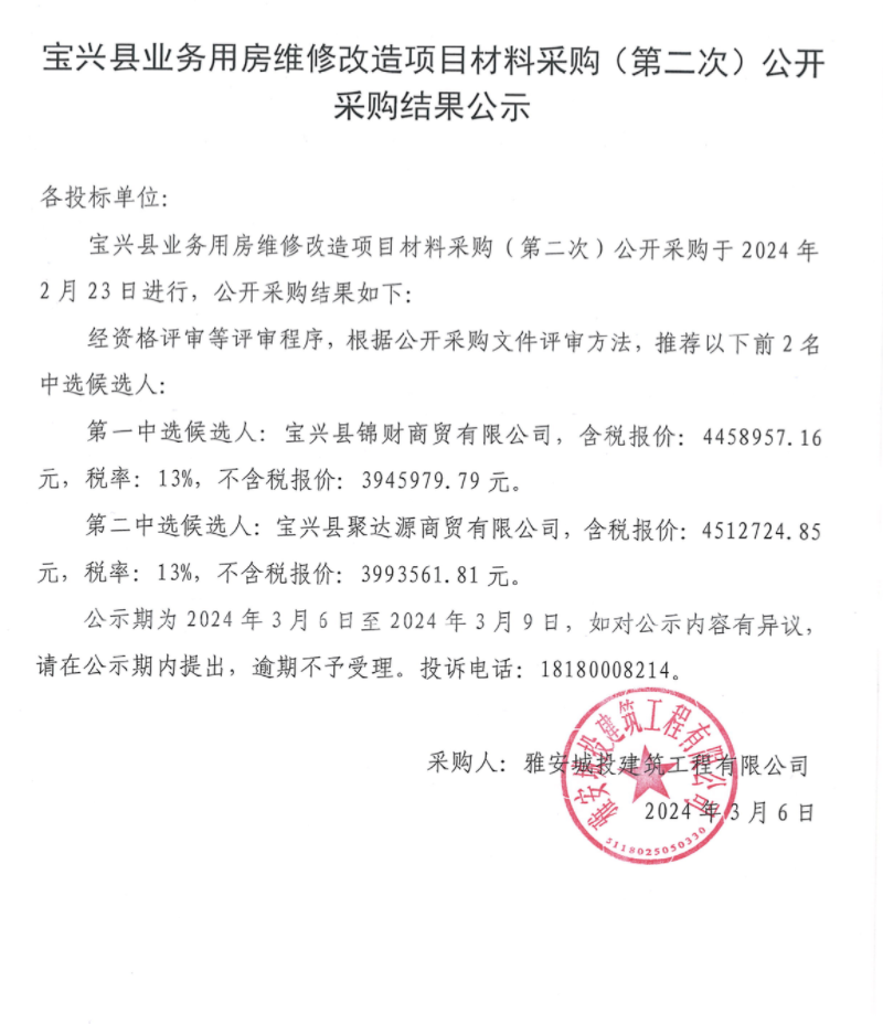 寶興縣業(yè)務(wù)用房維修改造項目材料采購(第二次)公開采購結(jié)果公示