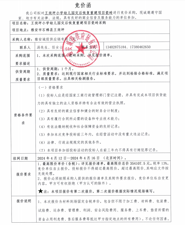 王崗坪小學(xué)幼兒園災(zāi)后恢復(fù)重建項(xiàng)目瓷磚競價(jià)公告